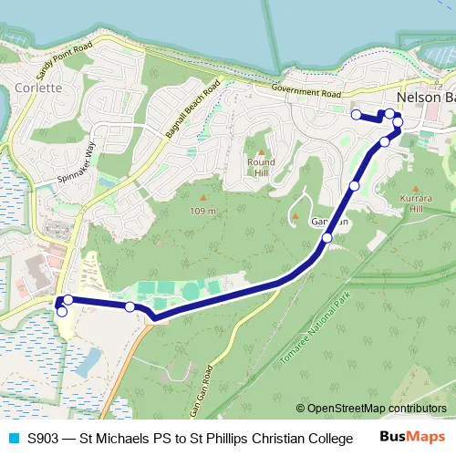 The first stop of the S903 bus route is St Michael's Primary School, Wahgunyah Rd and the last stop is St Phillips Christian College, School Grounds. S903 (St Michaels PS to St Phillips Christian College) is operational during entre semana.