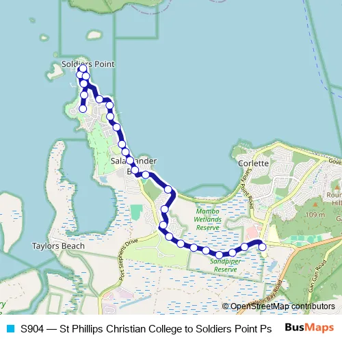 The first stop of the S904 bus route is St Phillips Christian College, School Grounds and the last stop is Soldiers Point Public School, Cromarty Rd. S904 (St Phillips Christian College to Soldiers Point Ps) is operational during entre semana.