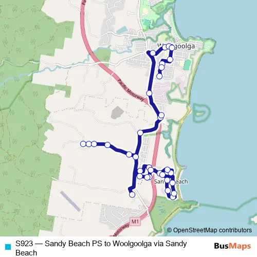 The first stop of the S923 bus route is Sandy Beach Public School, Saye Cl and the last stop is Scarborough St At Nightingale St. S923 (Sandy Beach PS to Woolgoolga via Sandy Beach) is operational during entre semana.