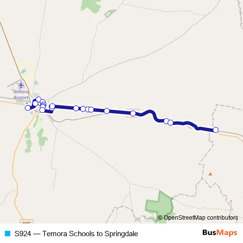 The first stop of the S924 bus route is Temora West Public School, Truskett St and the last stop is Green Lane Before Burley Griffin Way. S924 (Temora Schools to Springdale) is operational during entre semana.