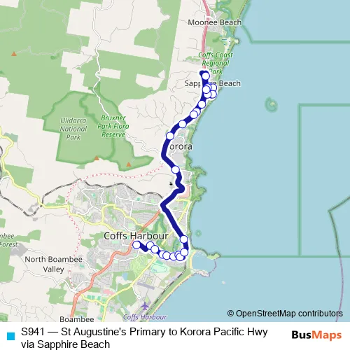 The first stop of the S941 bus route is St Augustine's Primary School, Gordon St and the last stop is Pacific Hwy After Opal Bvd. S941 (St Augustine's Primary to Korora Pacific Hwy via Sapphire Beach) is operational during entre semana.