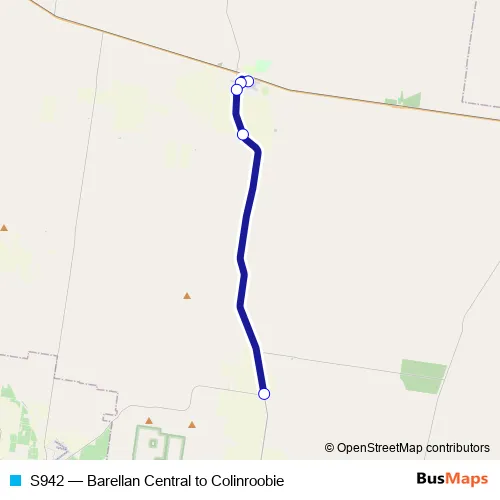 The first stop of the S942 bus route is Barellan Central School, Mulga St and the last stop is Barellan Rd Before Colinroobie Rd. S942 (Barellan Central to Colinroobie) is operational during entre semana.