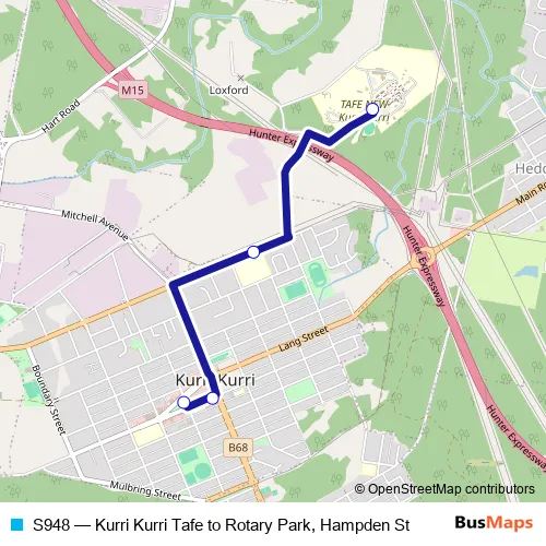 The first stop of the S948 bus route is Hunter Tafe Kurri Kurri Campus and the last stop is Rotary Park, Hampden St. S948 (Kurri Kurri Tafe to Rotary Park, Hampden St) is operational during entre semana.