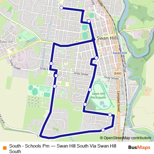 The first stop of the South - Schools Pm bus route is Swan Hill North Primary School/Chapman St and the last stop is Swan Hill College/High St. South - Schools Pm (Swan Hill South Via Swan Hill South) is operational during entre semana.