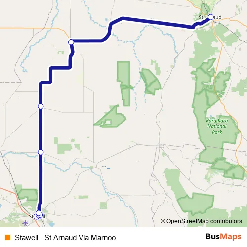 The first stop of the Stawell - St Arnaud Via Marnoo bus route is Stawell Station/Napier St and the last stop is