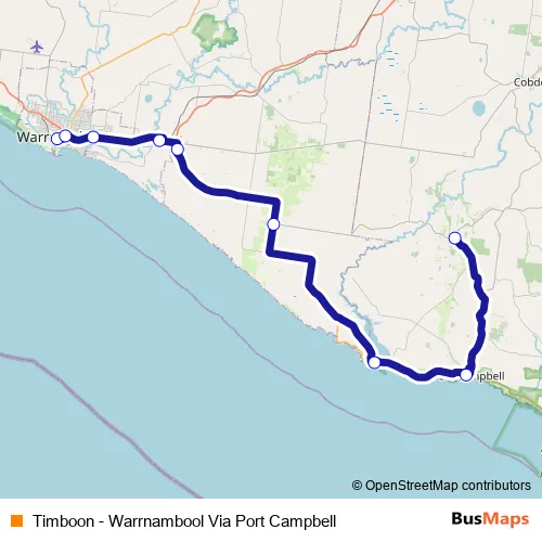 Additional information: Timboon - Warrnambool Via Port Campbell has 9 stops and the total trip duration for this route is approximately 90 minutes.