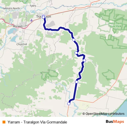 Additional information: Yarram - Traralgon Via Gormandale has 7 stops and the total trip duration for this route is approximately 65 minutes.