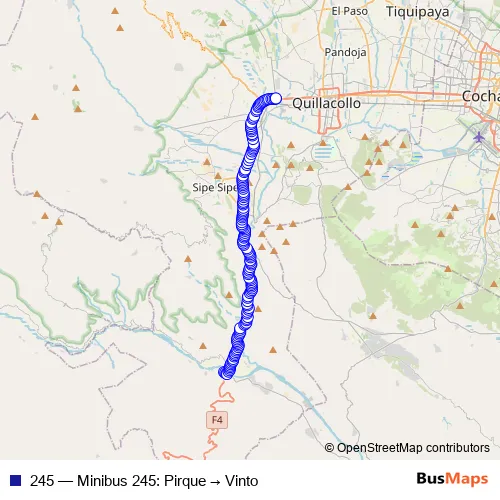 The first stop of the 245 bus route is innominada and the last stop is Avenida Albina Patiño y Avenida Pairumani. 245 (Minibus 245: Pirque → Vinto) is operational during todos los días.