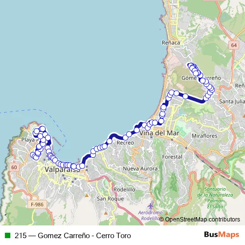 The first stop of the 215 bus route is Sold Barrea - Camino Queb Verde and the last stop is Veintiuno - Pte. Tres Sur. 215 (Gomez Carreño - Cerro Toro) is operational during todos los días.