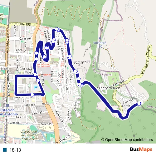 The first stop of the 18-13 bus route is AC 183 - KR 7a and the last stop is AC 183 - KR 7a. 18-13 is operational during todos los días.