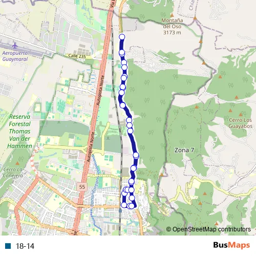 The first stop of the 18-14 bus route is AC 183 - KR 7a and the last stop is AC 183 - KR 7a. 18-14 is operational during todos los días.