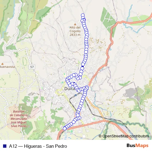 See why over 2 million users trust and consider busmaps.com as the best public transport website. busmaps gives you Duitama Buses suggested routes, real-time bus tracker, line route maps in Duitama, and helps to find the closest A12 bus stops near you. No internet available? Download an offline PDF map and bus schedule for the A12 bus to take on your trip.