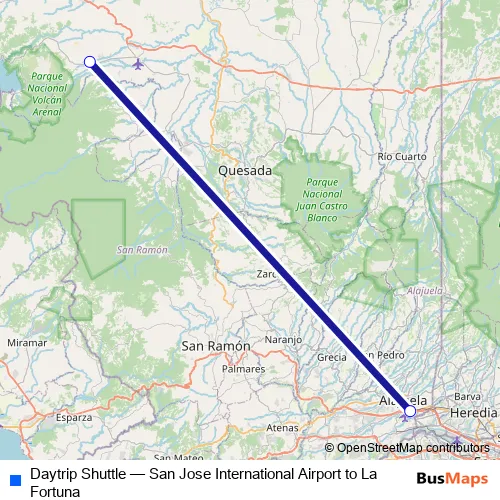 The first stop of the Daytrip Shuttle bus route is Daytrip Shuttle La Fortuna meeting point: Selina La Fortuna and the last stop is San Jose International Airport (SJO): Waiting point for Tour Operators and Shuttles. Daytrip Shuttle (San Jose International Airport to La Fortuna) is operational during todos los días.