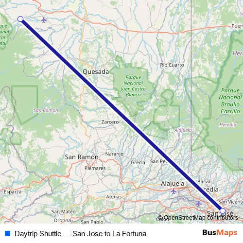 The first stop of the Daytrip Shuttle bus route is Daytrip Shuttle San Jose meeting point: Selina San Jose and the last stop is Daytrip Shuttle La Fortuna meeting point: Selina La Fortuna. Daytrip Shuttle (San Jose to La Fortuna) is operational during todos los días.