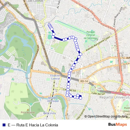 See why over 2 million users trust and consider busmaps.com as the best public transport website. busmaps gives you Santiago de los Caballeros Buses suggested routes, real-time bus tracker, line route maps in Santiago de los Caballeros, and helps to find the closest E bus stops near you. No internet available? Download an offline PDF map and bus schedule for the E bus to take on your trip.