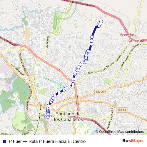 See why over 2 million users trust and consider busmaps.com as the best public transport website. busmaps gives you Santiago de los Caballeros Buses suggested routes, real-time bus tracker, line route maps in Santiago de los Caballeros, and helps to find the closest P Fuer bus stops near you. No internet available? Download an offline PDF map and bus schedule for the P Fuer bus to take on your trip.