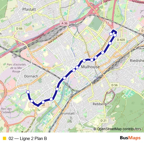 See why over 2 million users trust and consider busmaps.com as the best public transport website. busmaps gives you Mulhouse Buses suggested routes, real-time bus tracker, line route maps in Mulhouse, and helps to find the closest 02 bus stops near you. No internet available? Download an offline PDF map and bus schedule for the 02 bus to take on your trip.