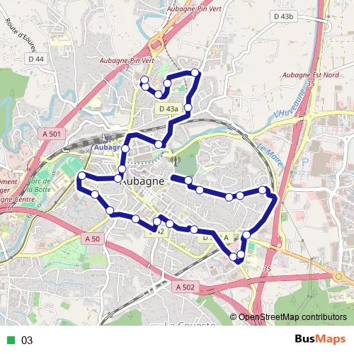 See why over 2 million users trust and consider busmaps.com as the best public transport website. busmaps gives you Aubagne Buses suggested routes, real-time bus tracker, line route maps in Aubagne, and helps to find the closest 03 bus stops near you. No internet available? Download an offline PDF map and bus schedule for the 03 bus to take on your trip.