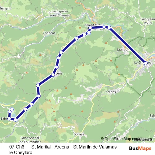 The first stop of the 07-Ch6 bus route is Collège Lycée 2 Vallées and the last stop is La Vierge. 07-Ch6 (St Martial - Arcens - St Martin de Valamas - le Cheylard) is operational during entre semana.