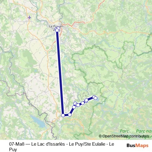 The first stop of the 07-Ma8 bus route is La Place and the last stop is Roche Arnaud. 07-Ma8 (Le Lac d'Issarlès - Le Puy/Ste Eulalie - Le Puy) is operational during todos los días.