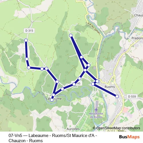 Click here to view the nearest 07-Vn5 - Labeaume - Ruoms/St Maurice d'A - Chauzon - Ruoms bus stop.