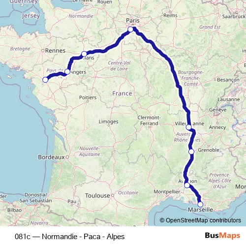 The first stop of the 081c rail route is Nantes and the last stop is Marseille Saint-Charles. 081c (Normandie - Paca - Alpes) is operational during los fines de semana.