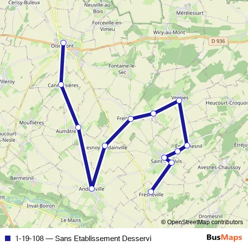 The first stop of the 1-19-108 bus route is Fresneville - Abribus and the last stop is Oisemont - Parking RPC Primaires. 1-19-108 (Sans Etablissement Desservi) is operational during entre semana.