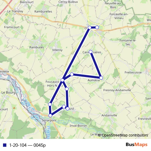 The first stop of the 1-20-104 bus route is Cannessieres - Abribus and the last stop is Oisemont - Collège Charles Bignon. 1-20-104 (0045p) is operational during entre semana.