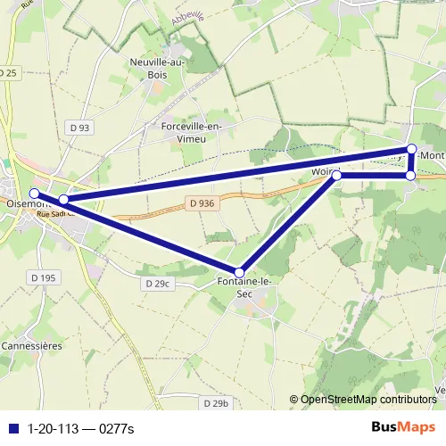 The first stop of the 1-20-113 bus route is Oisemont - Collège Charles Bignon and the last stop is Oisemont - Parking RPC Primaires. 1-20-113 (0277s) is operational during todos los días.