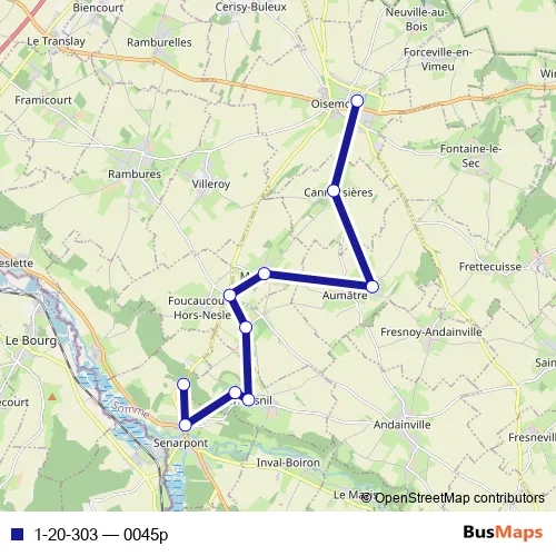 The first stop of the 1-20-303 bus route is Oisemont - Collège Charles Bignon and the last stop is Senarpont - Réderie. 1-20-303 (0045p) is operational during todos los días.