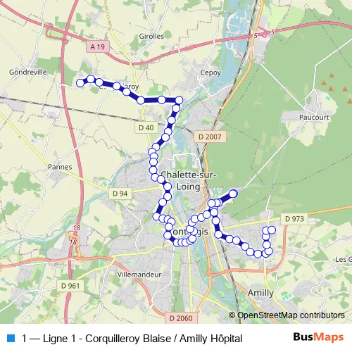Click here to view the nearest 1 - Ligne 1 - Corquilleroy Blaise / Amilly Hôpital bus stop.