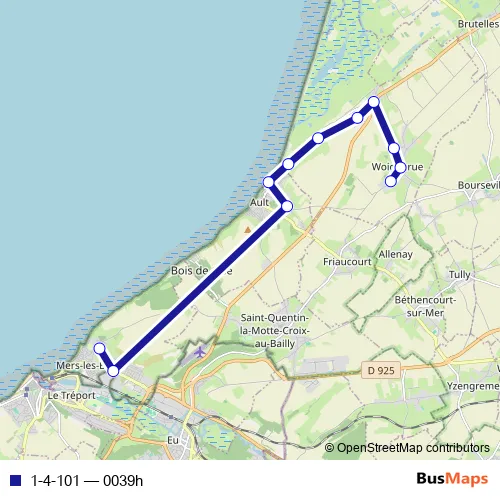 The first stop of the 1-4-101 bus route is Woignarue - Dufosse and the last stop is Mers-LES-Bains - Collège Joliot Curie. 1-4-101 (0039h) is operational during entre semana.
