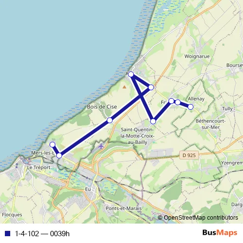 The first stop of the 1-4-102 bus route is Allenay - Rue d'Ault and the last stop is Mers-LES-Bains - Collège Joliot Curie. 1-4-102 (0039h) is operational during entre semana.