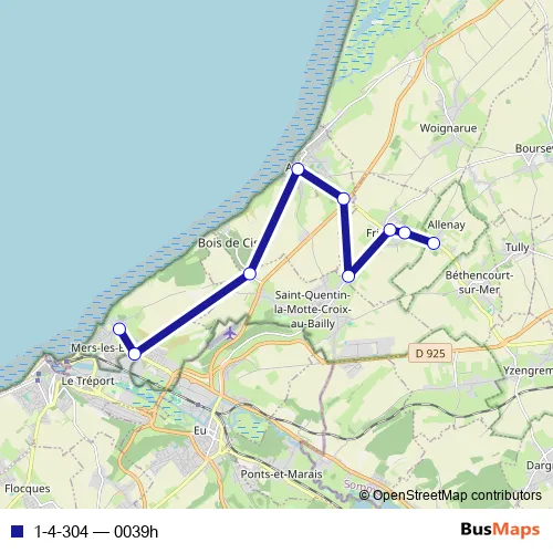 The first stop of the 1-4-304 bus route is Mers-LES-Bains - Collège Joliot Curie and the last stop is Allenay - Rue d'Ault. 1-4-304 (0039h) is operational during todos los días.