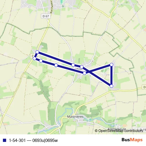The first stop of the 1-54-301 bus route is Aigneville - Ecole primaire and the last stop is
