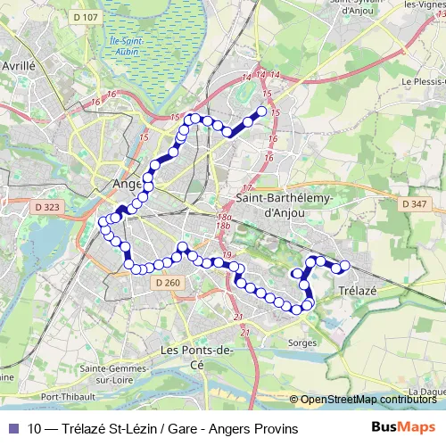 The first stop of the 10 bus route is Trélazé Gare and the last stop is Provins. 10 (Trélazé St-Lézin / Gare - Angers Provins) is operational during todos los días.