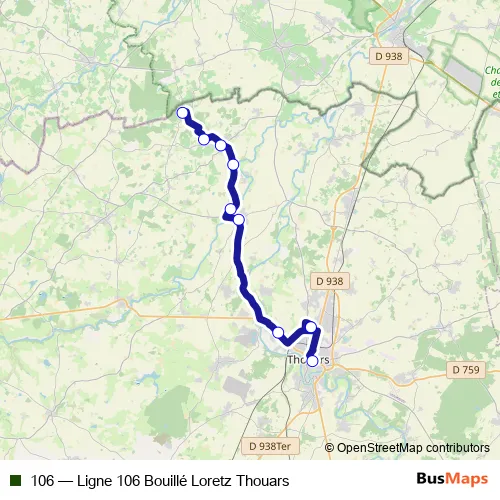 The first stop of the 106 bus route is place du Boël les halles and the last stop is Bouillé Loretz Ferrières. 106 (Ligne 106 Bouillé Loretz Thouars) is operational during entre semana.