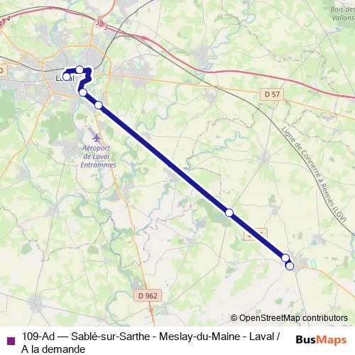 Services on the 109-Ad - Sablé-sur-Sarthe - Meslay-du-Maine - Laval / A la demande bus start at 18:55 on lunes, martes, miércoles, jueves, viernes, sábado.