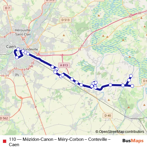 The first stop of the 110 bus route is Gare Routière and the last stop is Mery-Corbon - Lion d'Or. 110 (Mézidon-Canon – Méry-Corbon – Conteville – Caen) is operational during entre semana.
