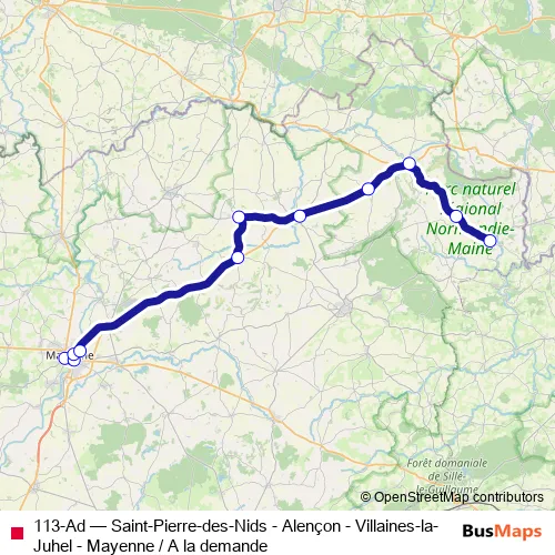 Services on the 113-Ad - Saint-Pierre-des-Nids - Alençon - Villaines-la-Juhel - Mayenne / A la demande bus start at 12:30 on lunes, martes, miércoles, jueves, viernes, sábado.