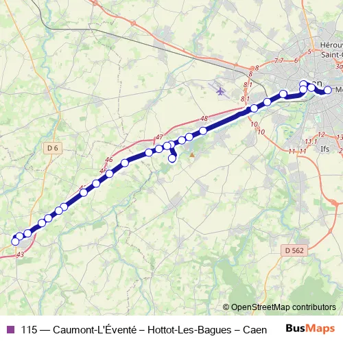 The first stop of the 115 bus route is Gare Routière and the last stop is Route d'Aunay. 115 (Caumont-L'Éventé – Hottot-Les-Bagues – Caen) is operational during entre semana.