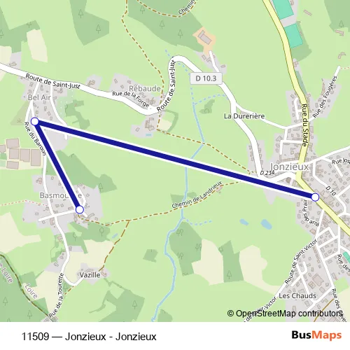 The first stop of the 11509 bus route is Basmouche and the last stop is Ecole Publique. 11509 (Jonzieux - Jonzieux) is operational during todos los días.