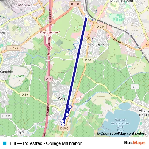 The first stop of the 118 bus route is Cave and the last stop is Collège Maintenon. 118 (Pollestres - Collège Maintenon) is operational during entre semana.