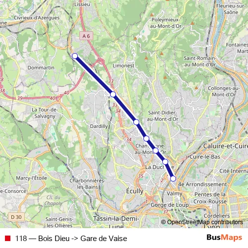 The first stop of the 118 bus route is Bois Dieu and the last stop is Gare de Vaise. 118 (Bois Dieu -> Gare de Vaise) is operational during todos los días.