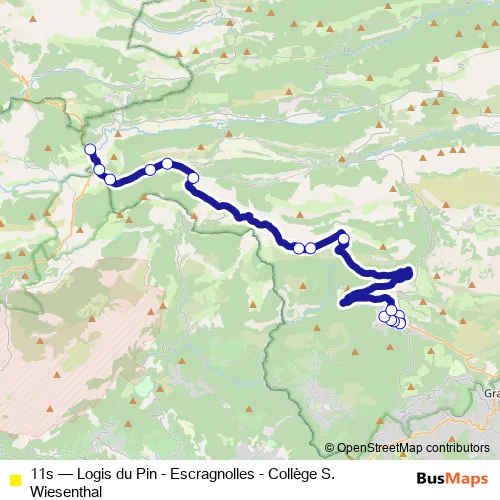 The first stop of the 11s bus route is College Simon Wiesenthal and the last stop is Logis DU PIN Parking. 11s (Logis du Pin - Escragnolles - Collège S.Wiesenthal) is operational during entre semana.
