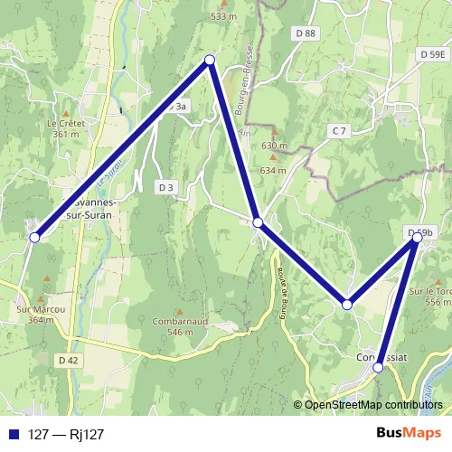 The first stop of the 127 bus route is Chavannes-sur-Suran-Nivigne-ET-Suran - Bois Clapay-NIV-Bois Clapa and the last stop is Corveissiat-Corveissiat - Village-COV-Village. 127 (Rj127) is operational during entre semana.