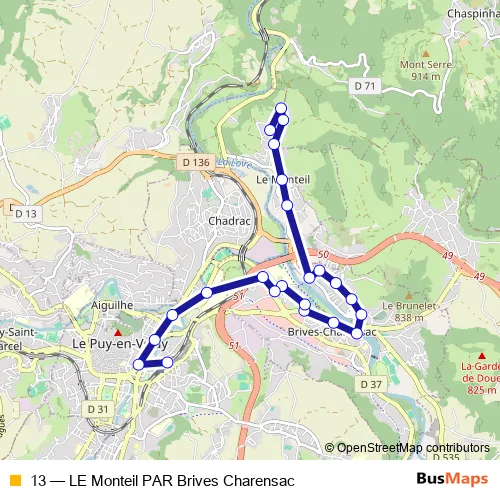 See why over 2 million users trust and consider busmaps.com as the best public transport website. busmaps gives you Le Puy-en-Velay Buses suggested routes, real-time bus tracker, line route maps in Le Puy-en-Velay, and helps to find the closest 13 bus stops near you. No internet available? Download an offline PDF map and bus schedule for the 13 bus to take on your trip.