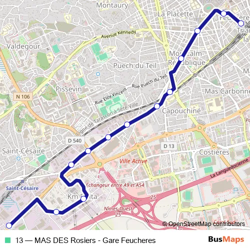 See why over 2 million users trust and consider busmaps.com as the best public transport website. busmaps gives you Nimes Buses suggested routes, real-time bus tracker, line route maps in Nimes, and helps to find the closest 13 bus stops near you. No internet available? Download an offline PDF map and bus schedule for the 13 bus to take on your trip.
