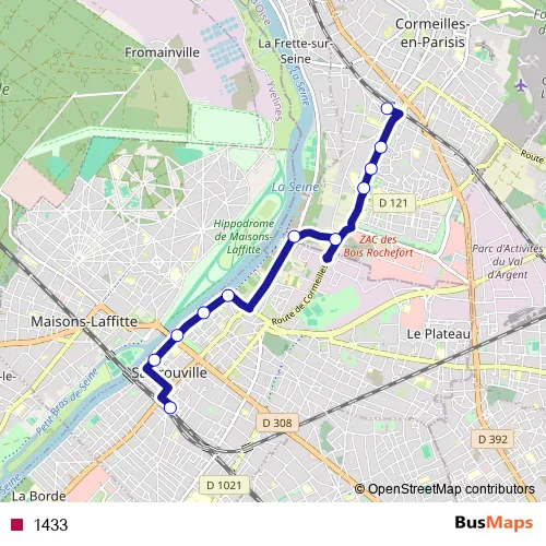 The first stop of the 1433 bus route is Gare de Sartrouville and the last stop is Gare de Cormeilles-en-Parisis. 1433 is operational during todos los días.