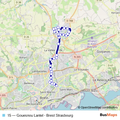 The first stop of the 15 bus route is Strasbourg Jaurès and the last stop is Lantel. 15 (Gouesnou Lantel - Brest Strasbourg) is operational during todos los días.